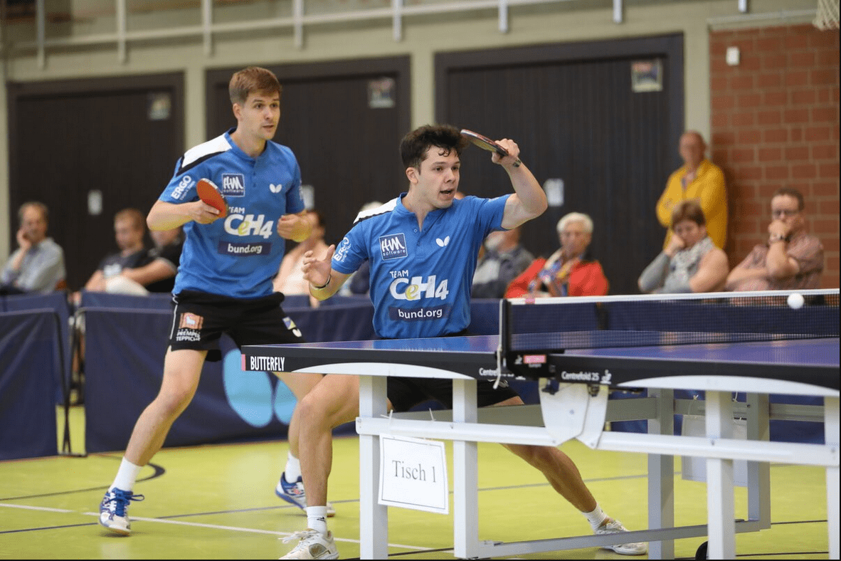 Trotzdem rechneten wir uns Chancen auf einen Punktgewinn aus. Im Doppel trennte man sich 1:1 unentschieden, wobei Hohmeier/Vos, s. Foto, knapp mit 11:9 im fünften Satz gegen das Spitzendoppel der Gastgeber, Servaty/Hersel, siegten. Bereits in diesem Match merkte man unserer Nummer eins, Eusebio Vos, an, dass er aufgrund eines Infektes, den er sich von seiner Turnierserie in den USA, mitgebracht hatte, nicht 100 % fit war. Das zweite Celler Doppel, Aydin/Hubli, hatten in einem umkämpften Match gegen Limonov/Panic das Nachsehen.