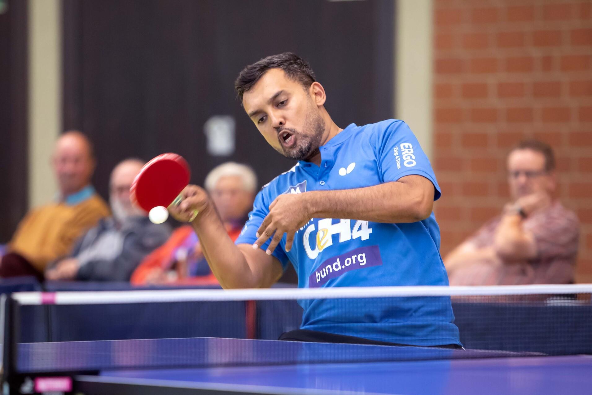 Ebenso hochklassig wie in den ersten Einzeln im oberen Paarkreuz, waren dann auch die Spiele in der zweiten Einzelrunde. Trotz guter Leistung, unterlag Deniz dem Mexikaner Rogelio Castro mit 3:0. Parallel kämpfte sich Eusebio Vos nach einem 0:2 Satzrückstand gegen seinen ehemaligen Trainingskameraden aus Grünwettersbach, Marc Gutierrez, in den fünften Satz. Immer wieder gelang es ihm dabei in den knallhart geführten Vorhand Top Spin Rallys zu punkten. Im fünften Satz lagen beide bis zum 9:9 gleich auf, leider hatte dann der Spanier mit 11:9 das glücklichere Ende für sich. Sodass die Gäste mit 5:3 in Führung gingen.