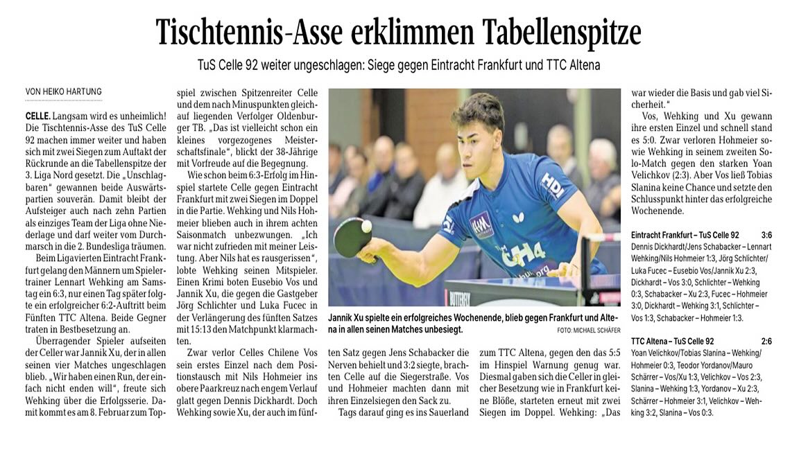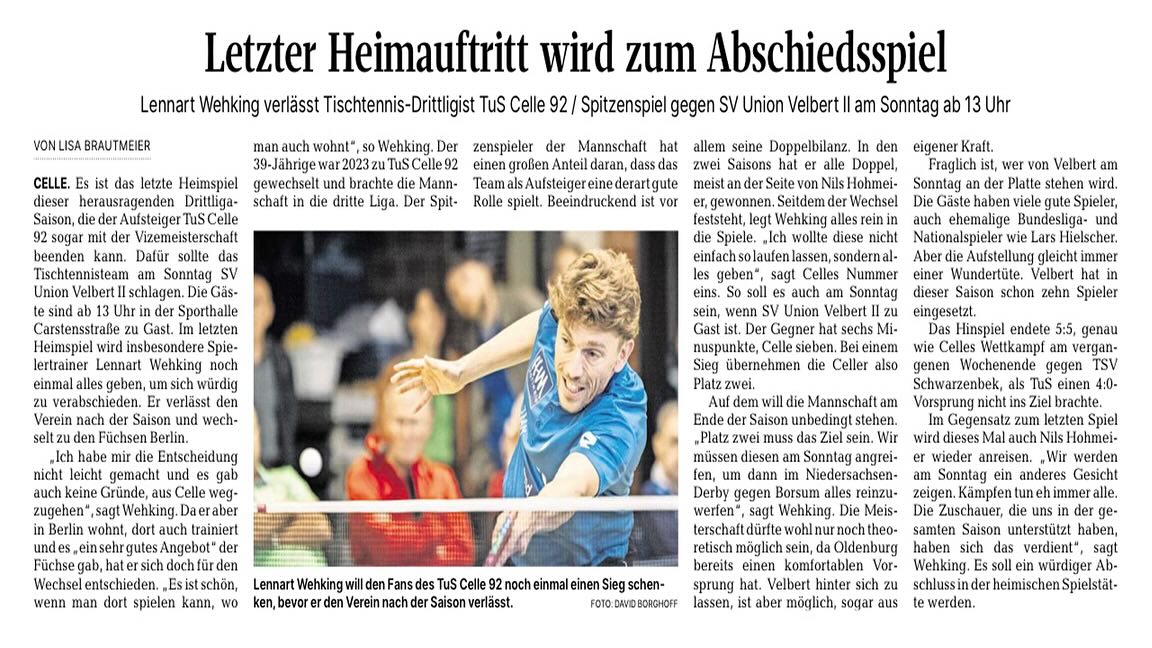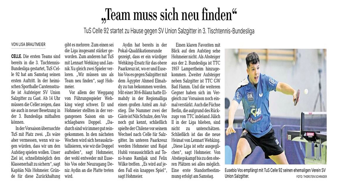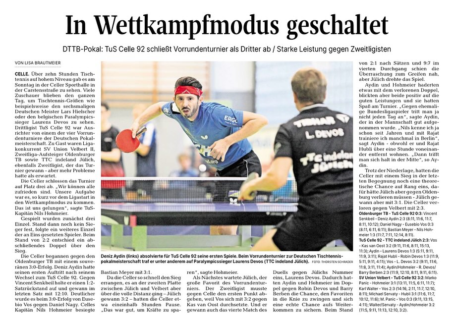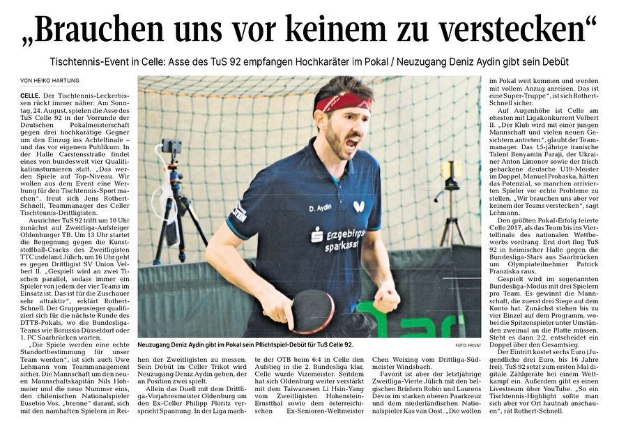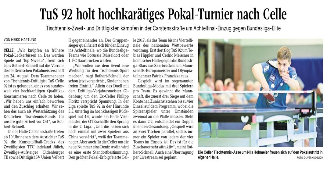 Nur noch zwei Tage und dann heißt es DTTB-Pokal - da wollen wir Euch den Bericht der Cellesche Zeitung natürlich nicht vorenthalten, um schon einmal in Stimmung zu kommen.
