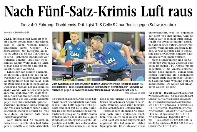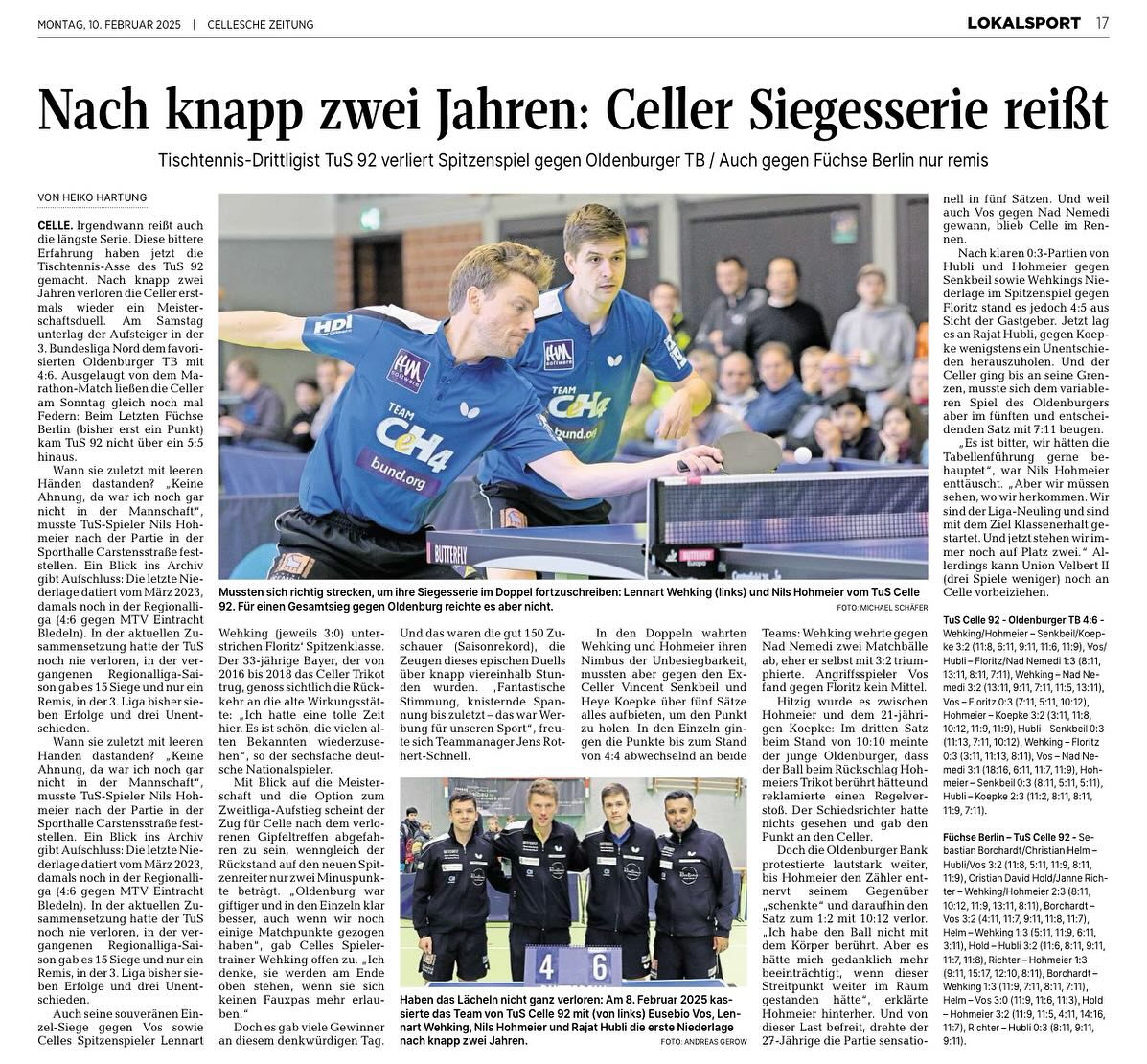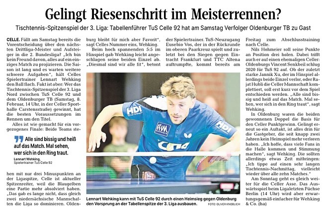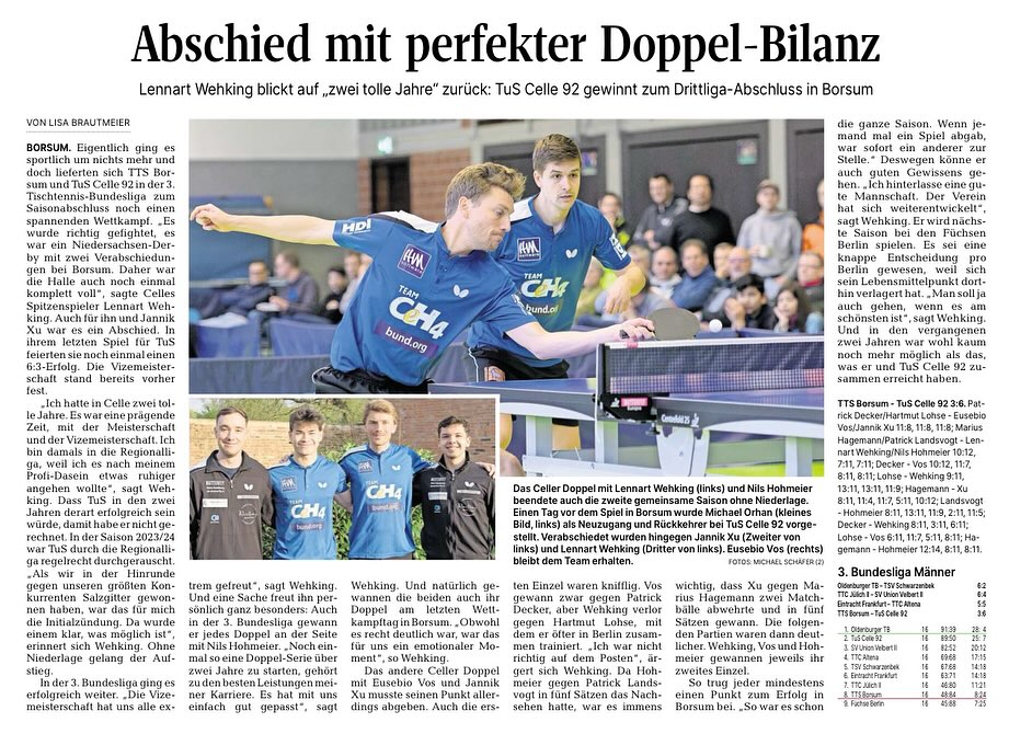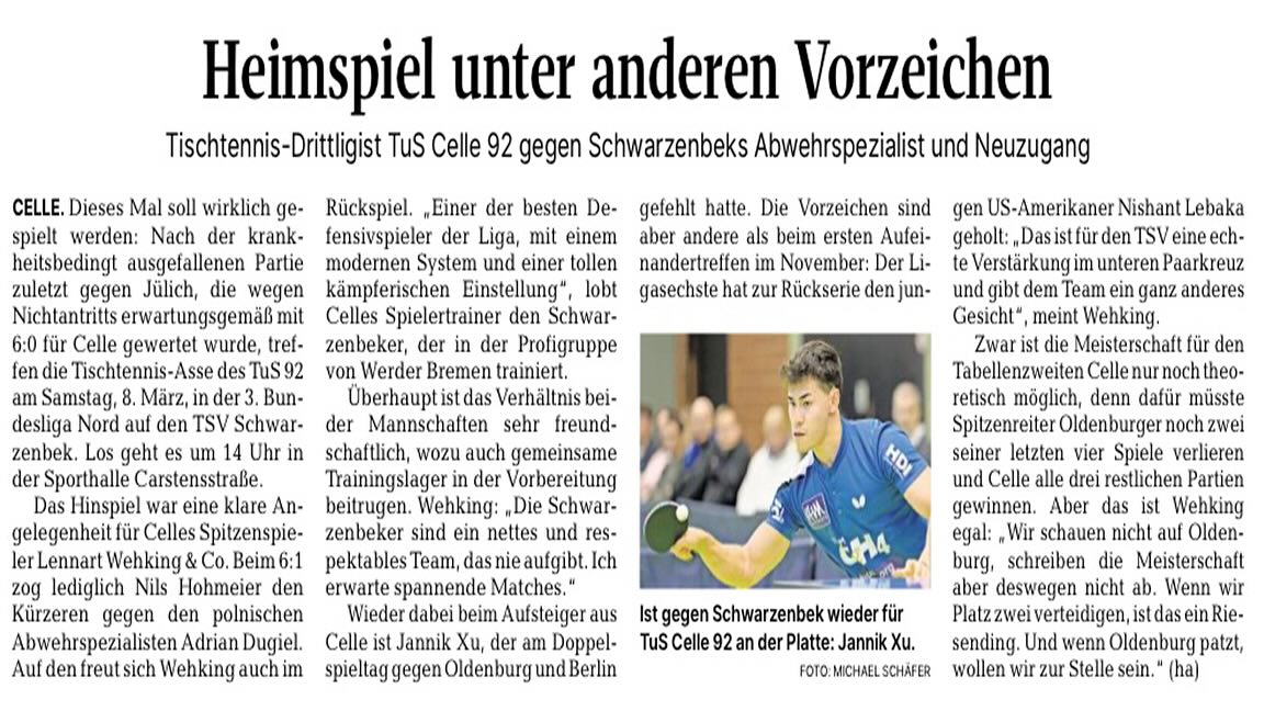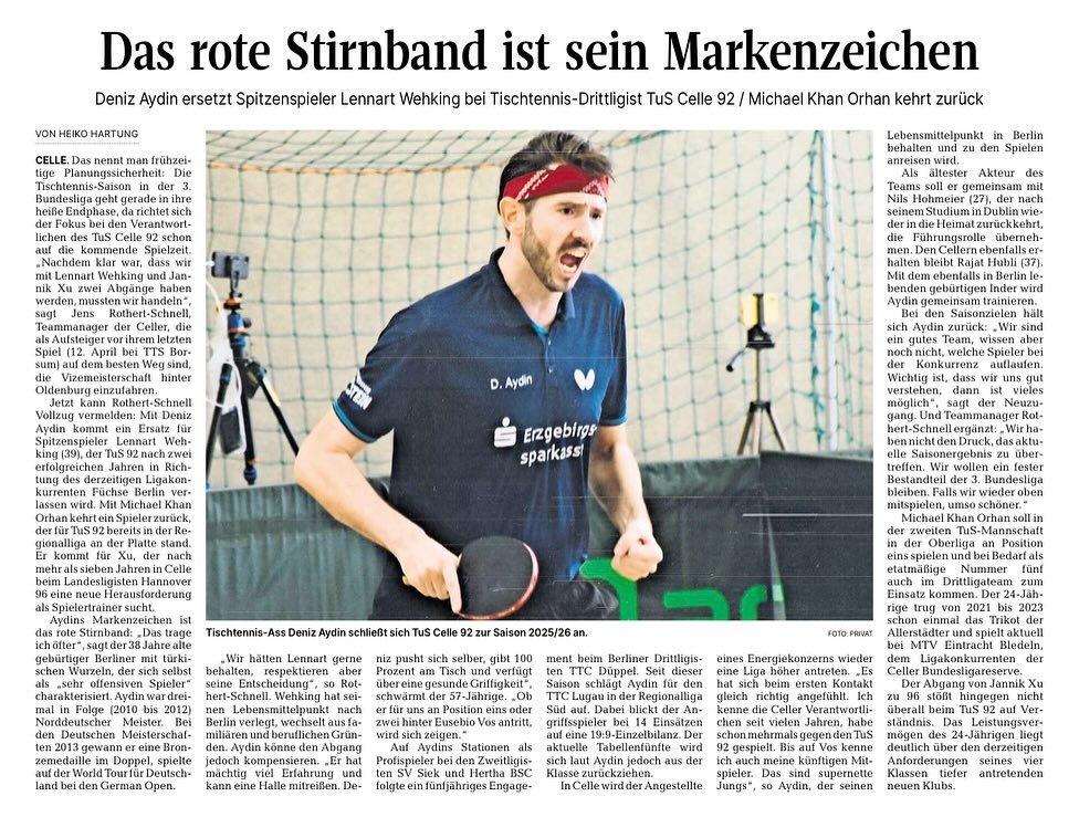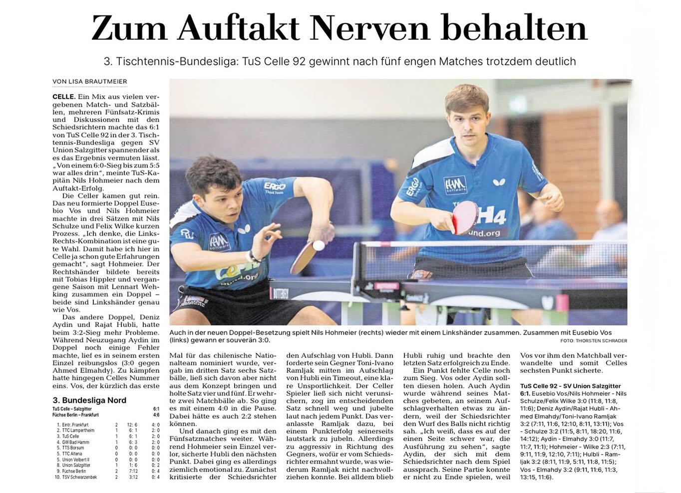 Nur noch zwei Tage und dann heißt es DTTB-Pokal - da wollen wir Euch den Bericht der Cellesche Zeitung natürlich nicht vorenthalten, um schon einmal in Stimmung zu kommen.