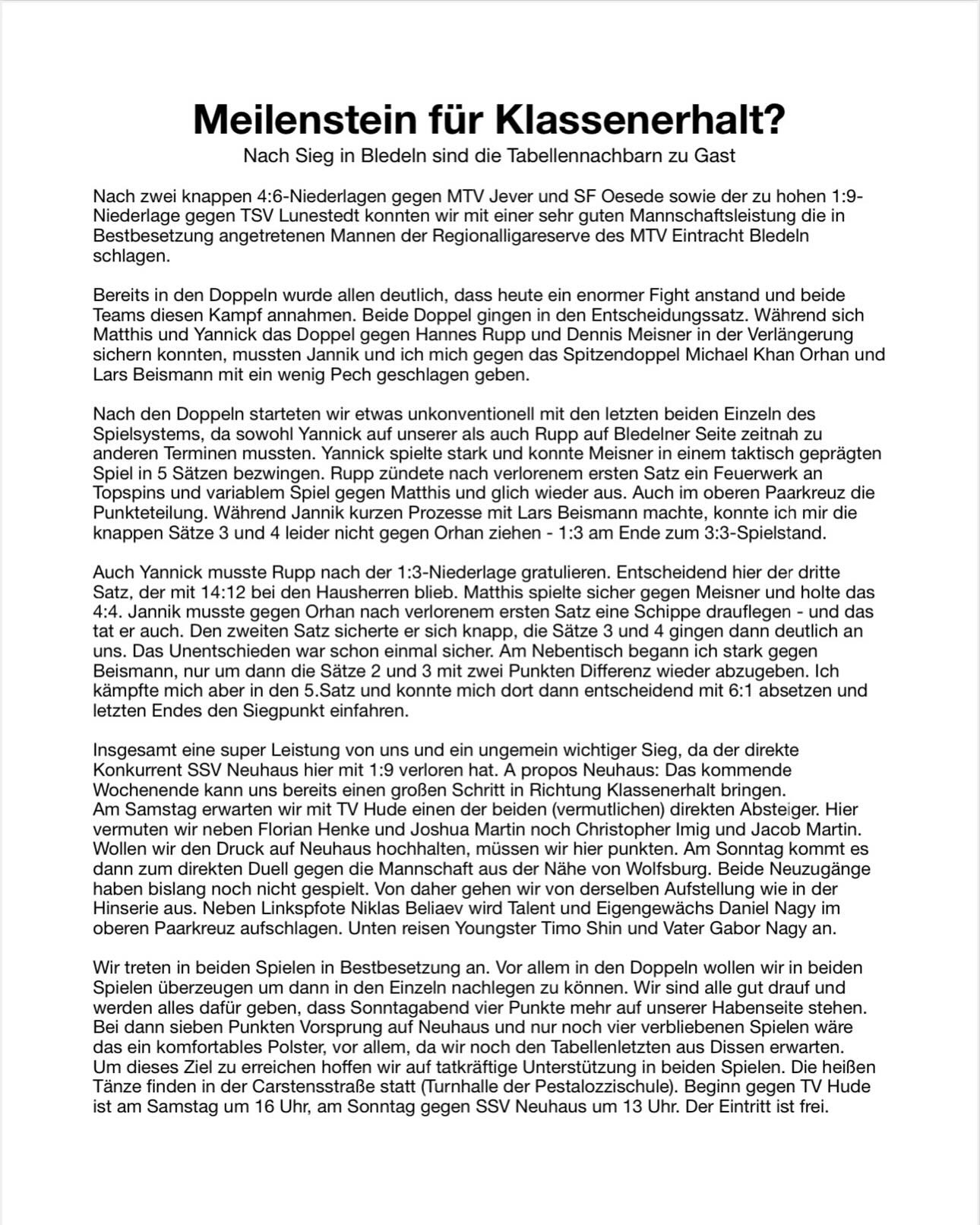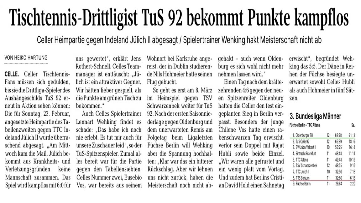 So bleibt uns dieses Mal nur, Euch auch ohne Tischtennis ein schönes Wochenende zu wünschen und wir hoffen, dass der beigefügte Presseartikel zumindest etwas über den Ausfall der Partie hinwegtrösten kann.