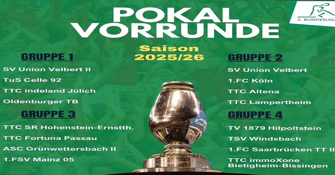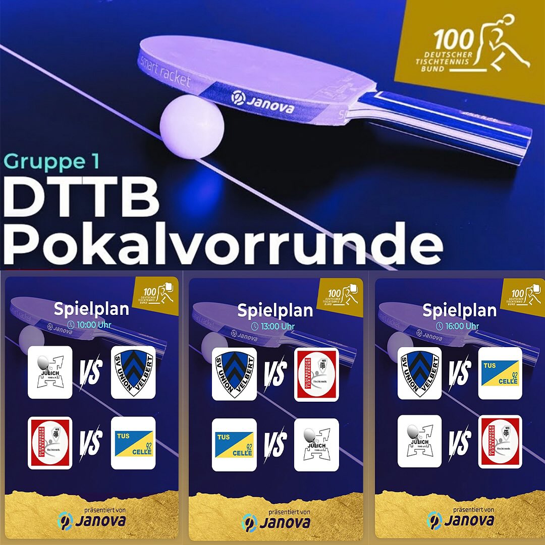 Am Sonntag, den 24. August richten wir eine der vier DTTB-Pokalvorrunden bei uns in heimischer Halle aus und treffen dabei - mit @ttc_indeland_juelich (2. Bundesliga), @otb_tischtennis (2. Bundesliga) und @svunionvelbert.tt II (3. Bundesliga) - auf hochkarätige Gegner.