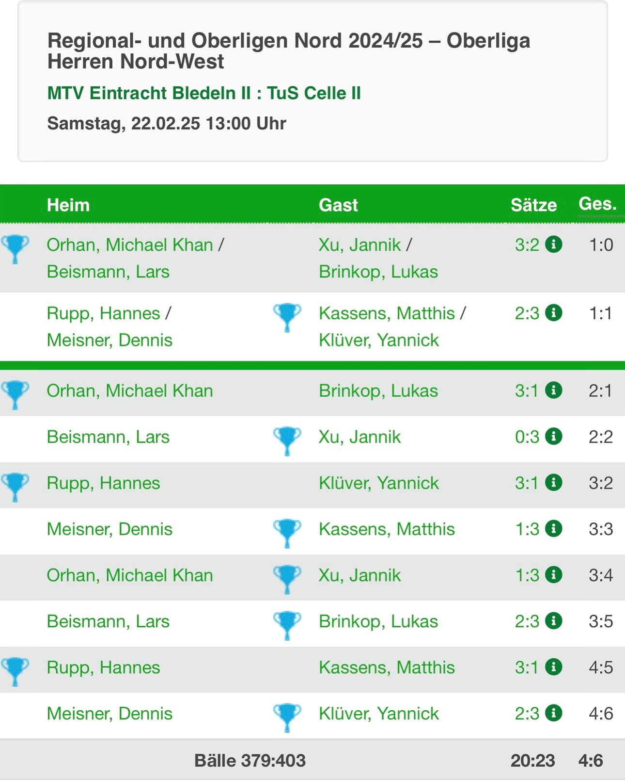 Eine gute Nachricht: Die Zweite konnte die Regionalligareserve von Eintracht Bledeln auswärts mit 6:4 besiegen und damit einen großen Schritt in Richtung Klassenerhalt machen.